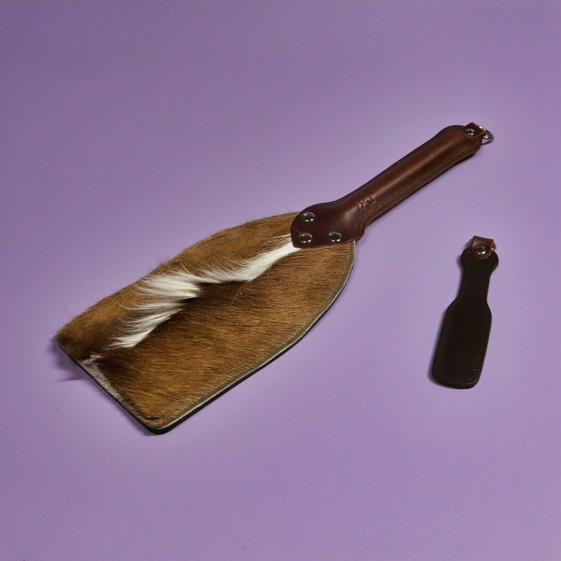 The Booty Beater is a broad, satisfying paddle made from firm brown leather and finished with distinctive springbok hide. This particular piece features the crest of fur on the springbok’s back, giving it an extra bit of texture and a look you will not see twice. The firm leather provides structure and a more decisive feel in use, while the springbok adds natural pattern and a softer, tactile surface.