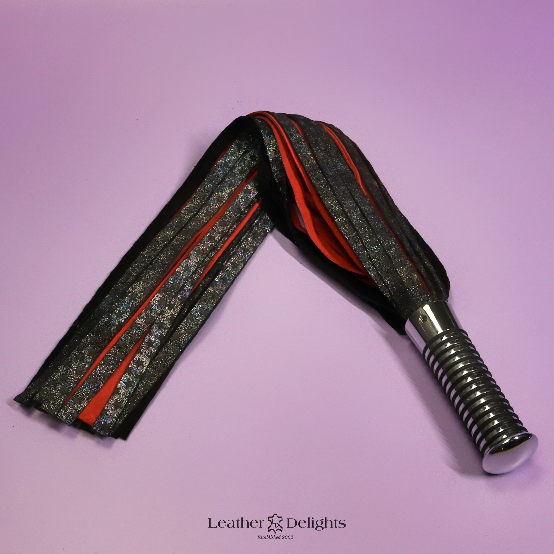 Add a touch of celestial sparkle to your collection with our unique Torture Chamber Flogger, featuring shimmering rainbow metallic embossed stars. The distinctive design combines metallic star-patterned leather with soft red suede falls, each precisely cut to 10mm wide and 2mm thick, creating a flogger that's both enchanting and functional. Handcrafted in our UK workshop. The leather-suede construction ensures a perfect balance of flexibility and control, delivering sensual sensations with every swing. Like all our implements, this flogger comes with our lifetime guarantee, making it a delightfully eye-catching addition to any enthusiast's collection.
