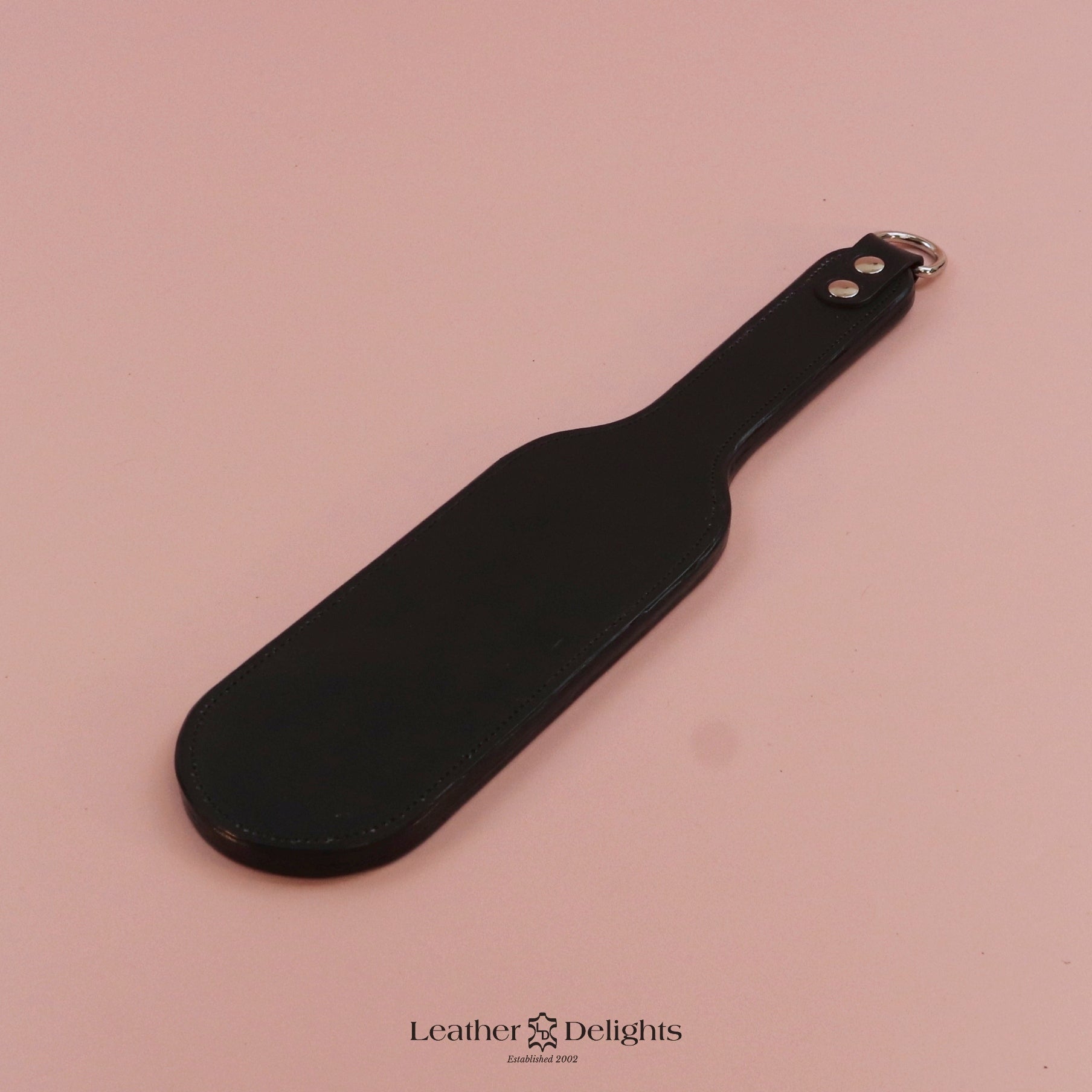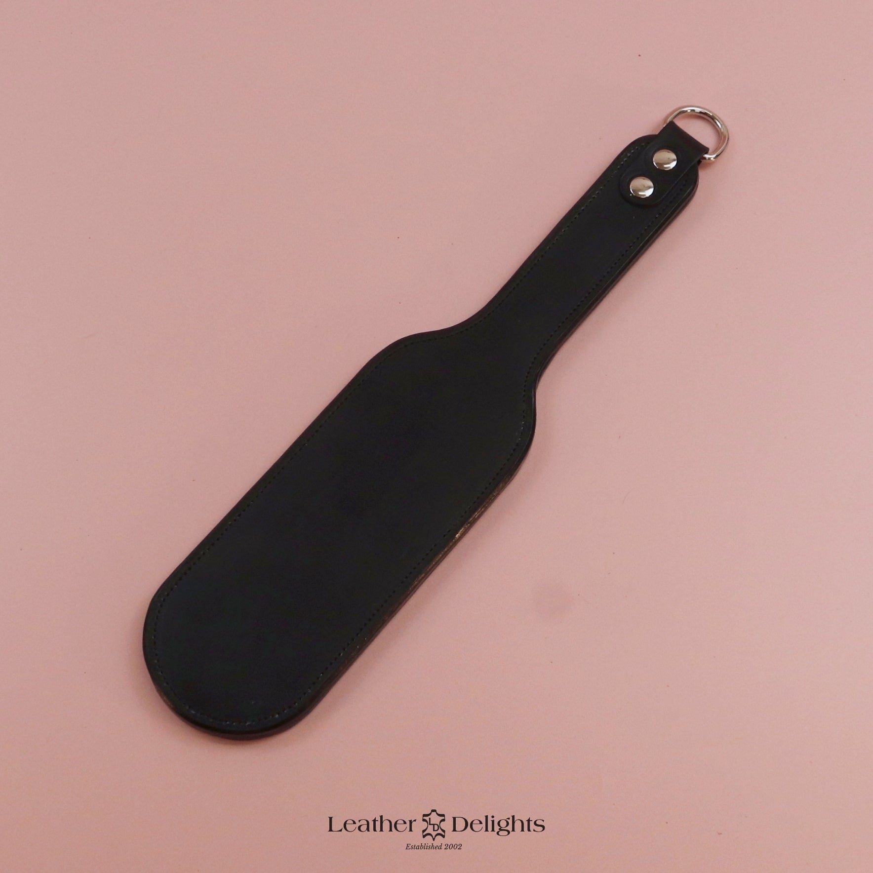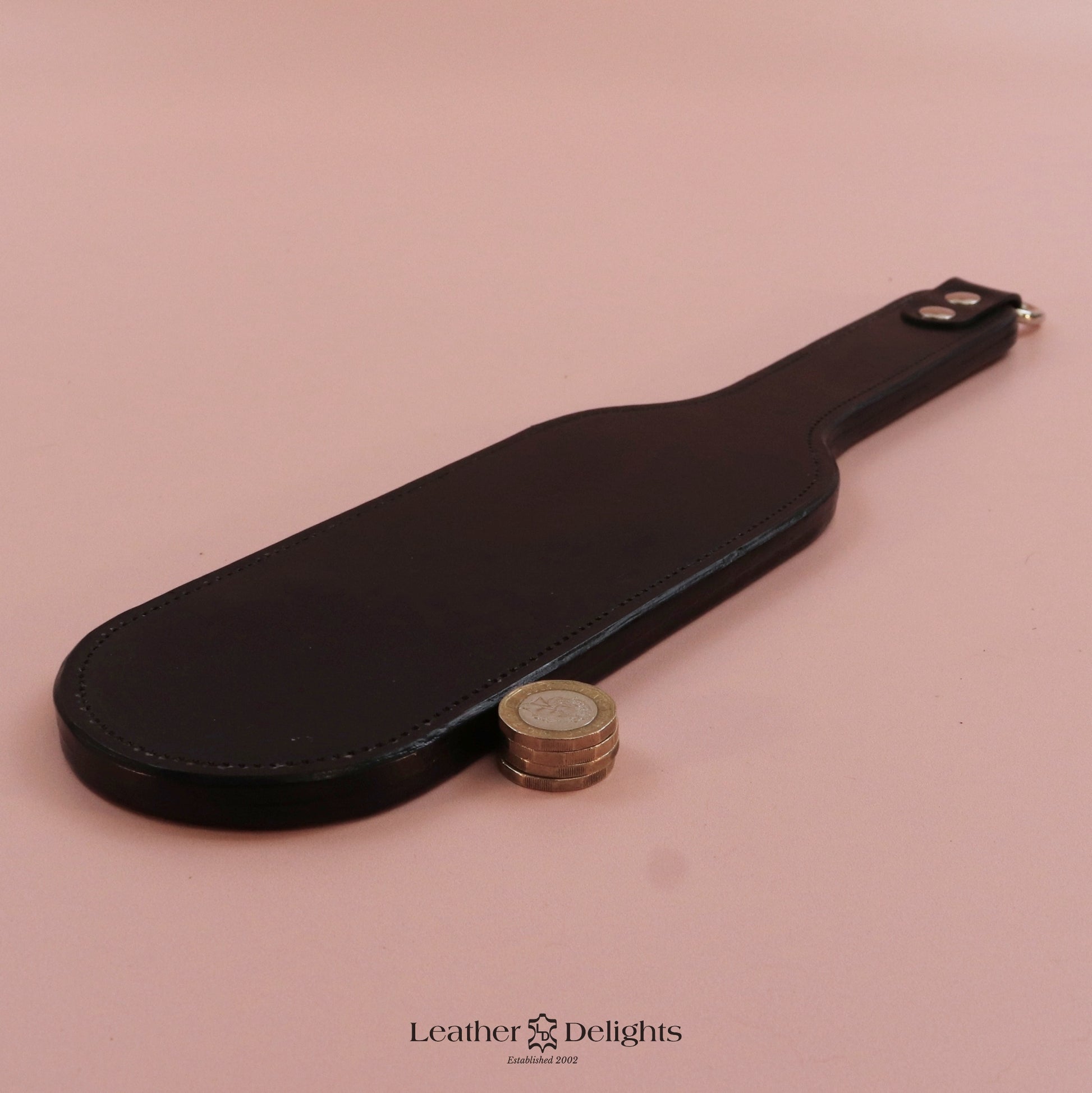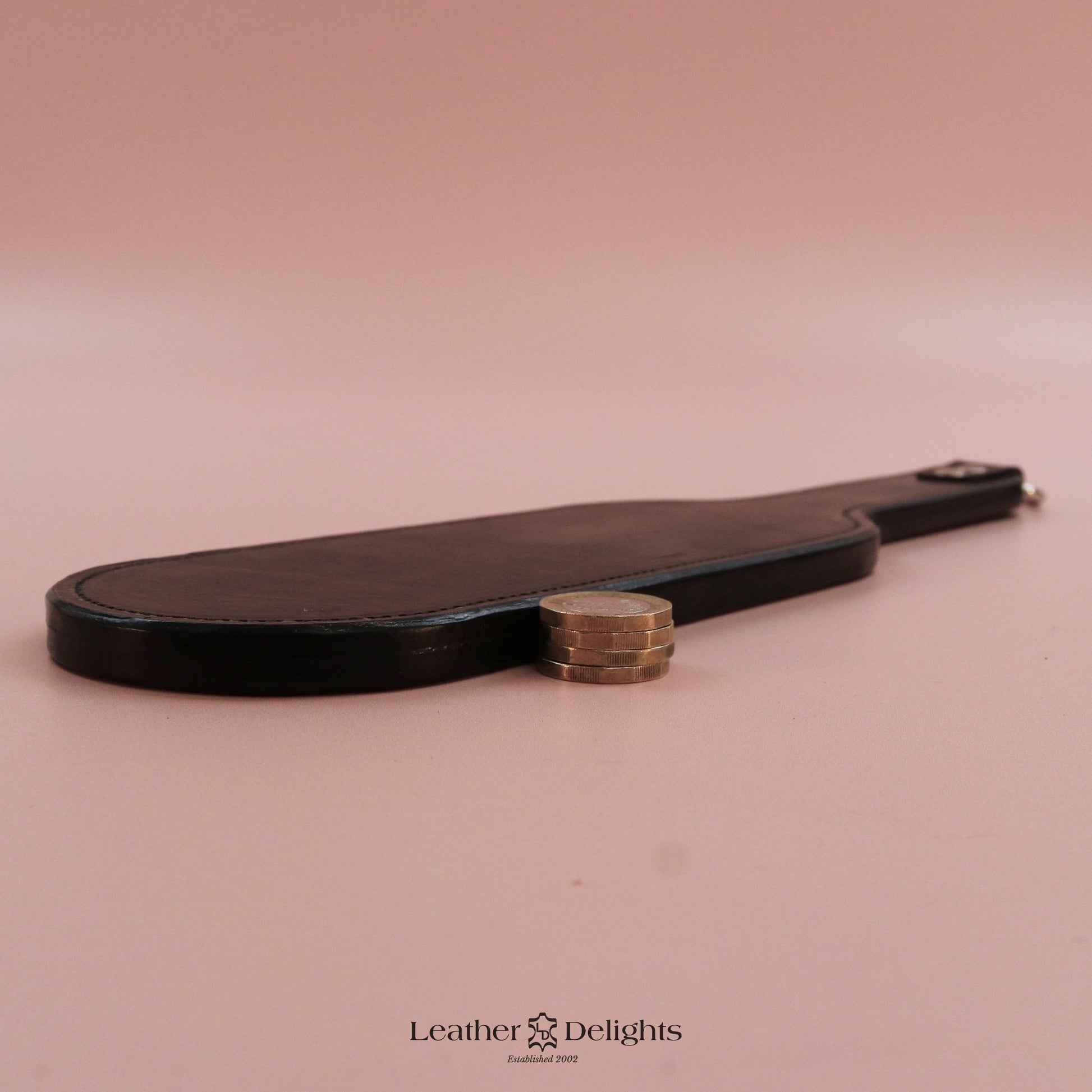 Experience unparalleled quality with our Colossus Paddle, crafted from premium English Oak Bark Tanned Leather. The striking design combines two layers of this exceptional leather, creating an impressive 11mm thickness for substantial impact and weight. Handcrafted in our UK workshop. The dual-layer construction ensures maximum firmness and minimal flex, delivering intense, consistent sensations with every strike. Like all our implements, this paddle comes with our lifetime guarantee, making it a distinguished addition to any enthusiast's collection.