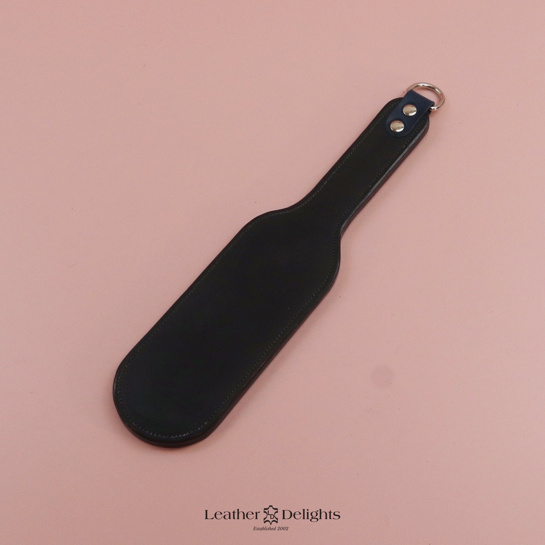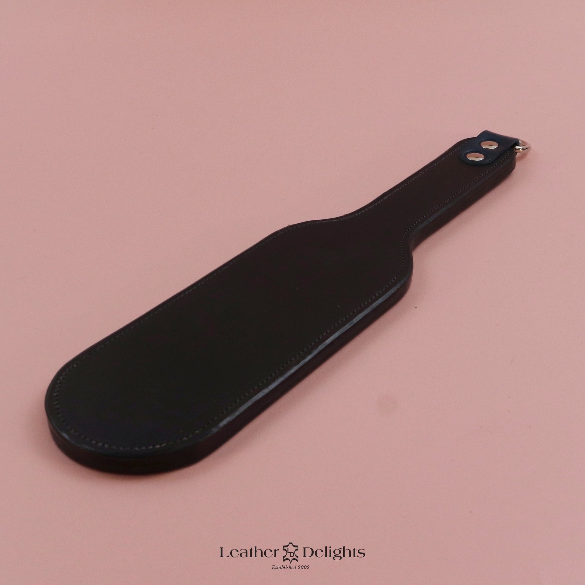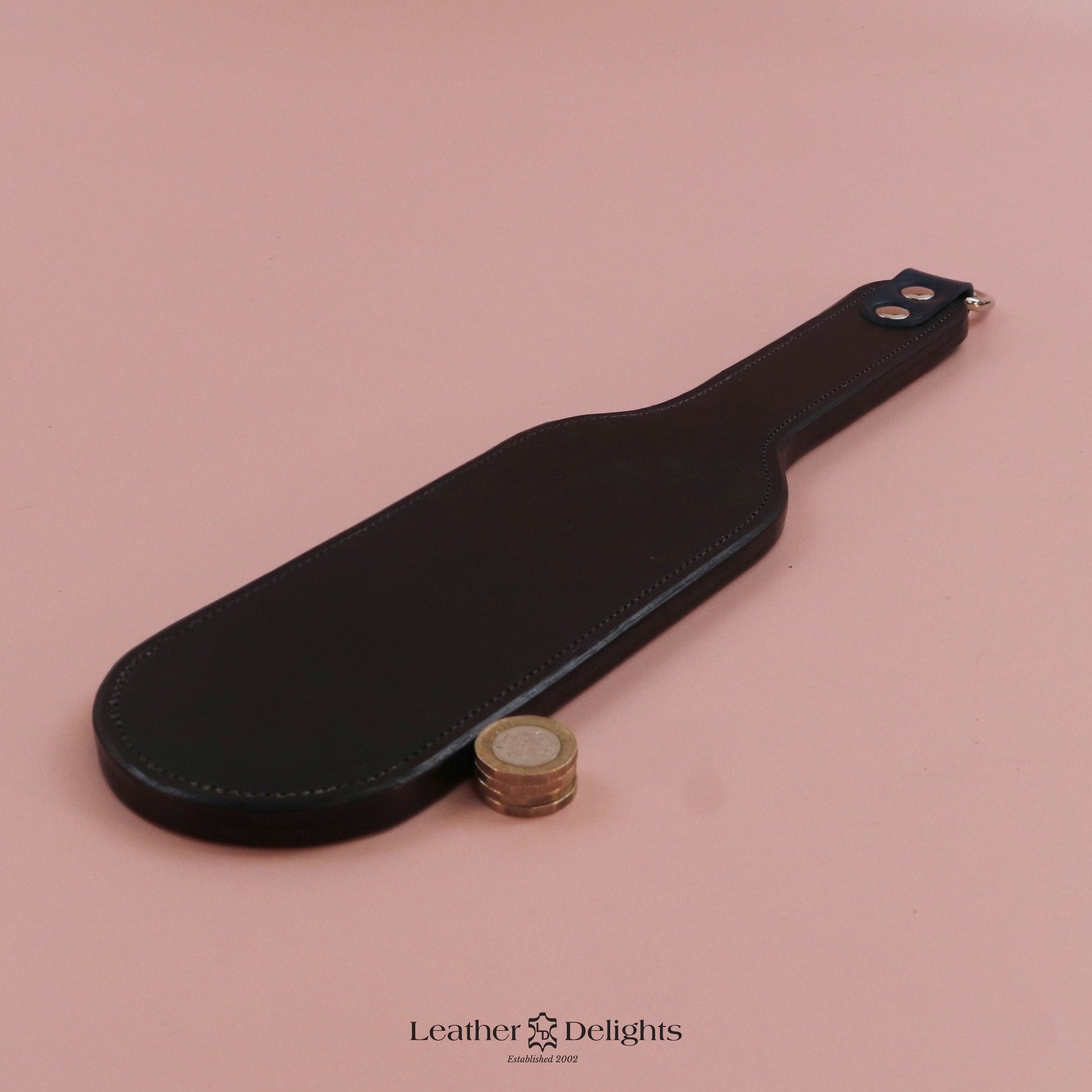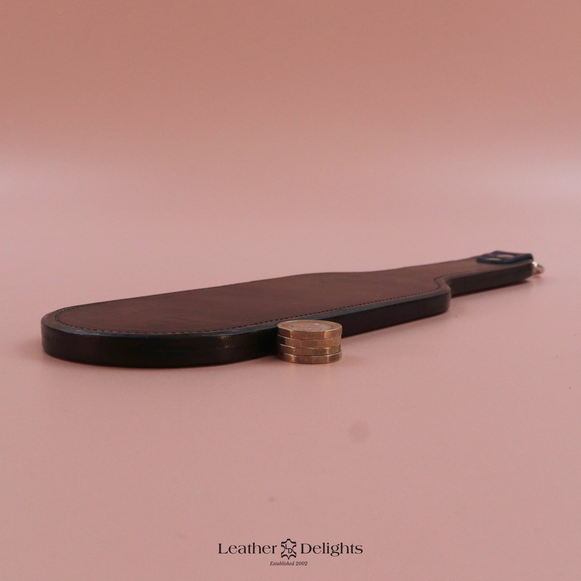 Experience unparalleled quality with our Colossus Paddle, crafted from premium English Oak Bark Tanned Leather. The striking design combines two layers of this exceptional leather, creating an impressive 11mm thickness for substantial impact and weight. Handcrafted in our UK workshop. The dual-layer construction ensures maximum firmness and minimal flex, delivering intense, consistent sensations with every strike. Like all our implements, this paddle comes with our lifetime guarantee, making it a distinguished addition to any enthusiast's collection.