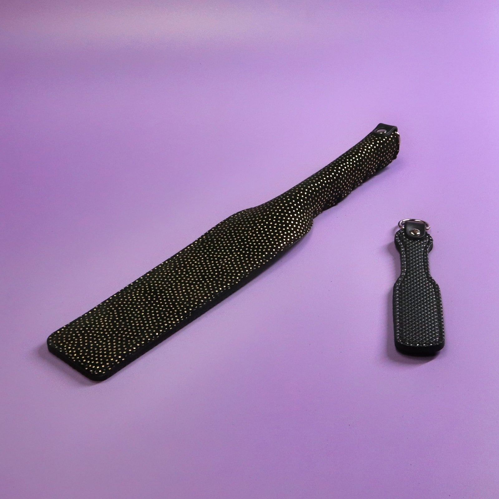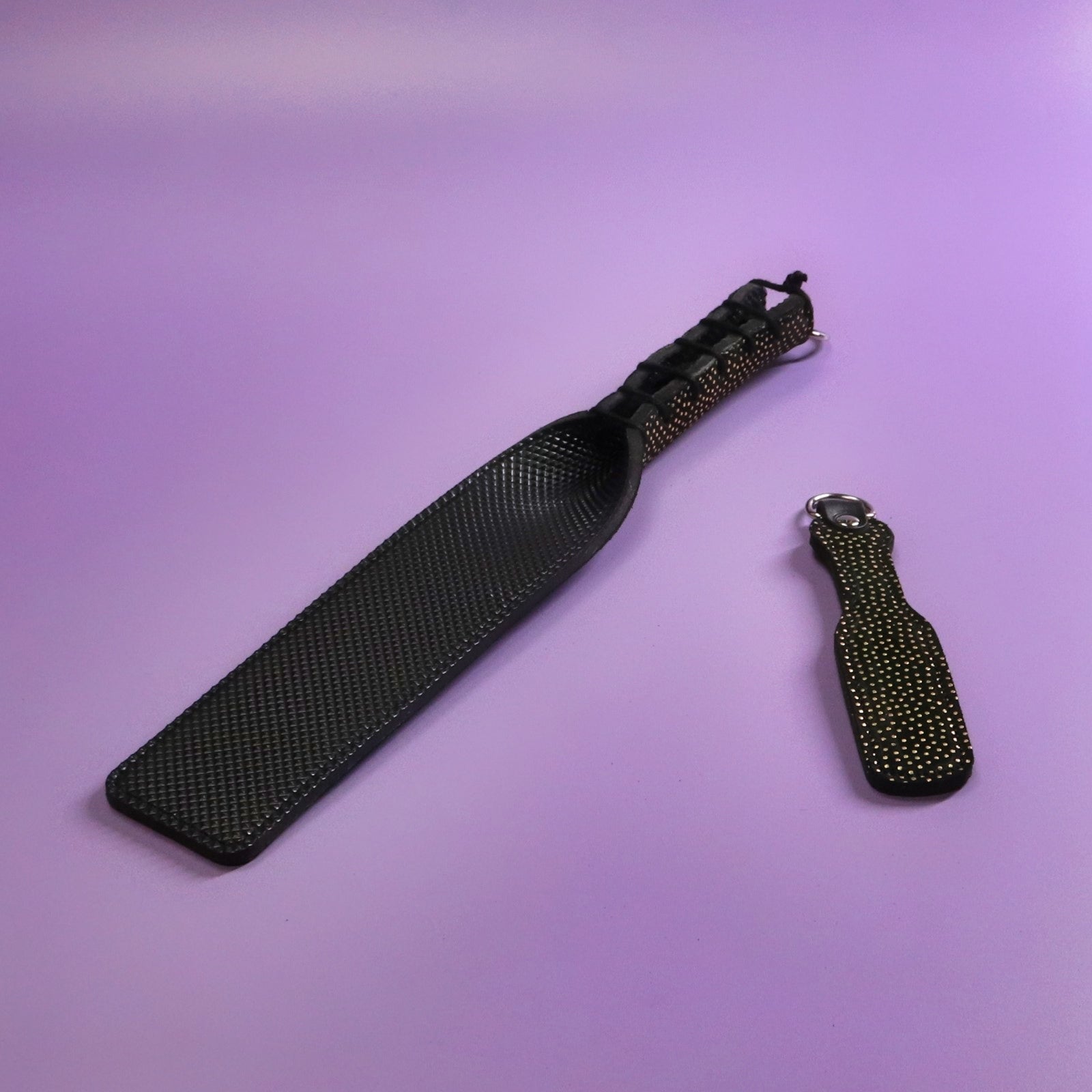 - Dimpled Rubber: 6mm thick dimpled rubber provides a distinctive, tactile experience on BDSM paddles, offering a firm grip and a stimulating, textured impact that enhances the visual and sensory intensity.