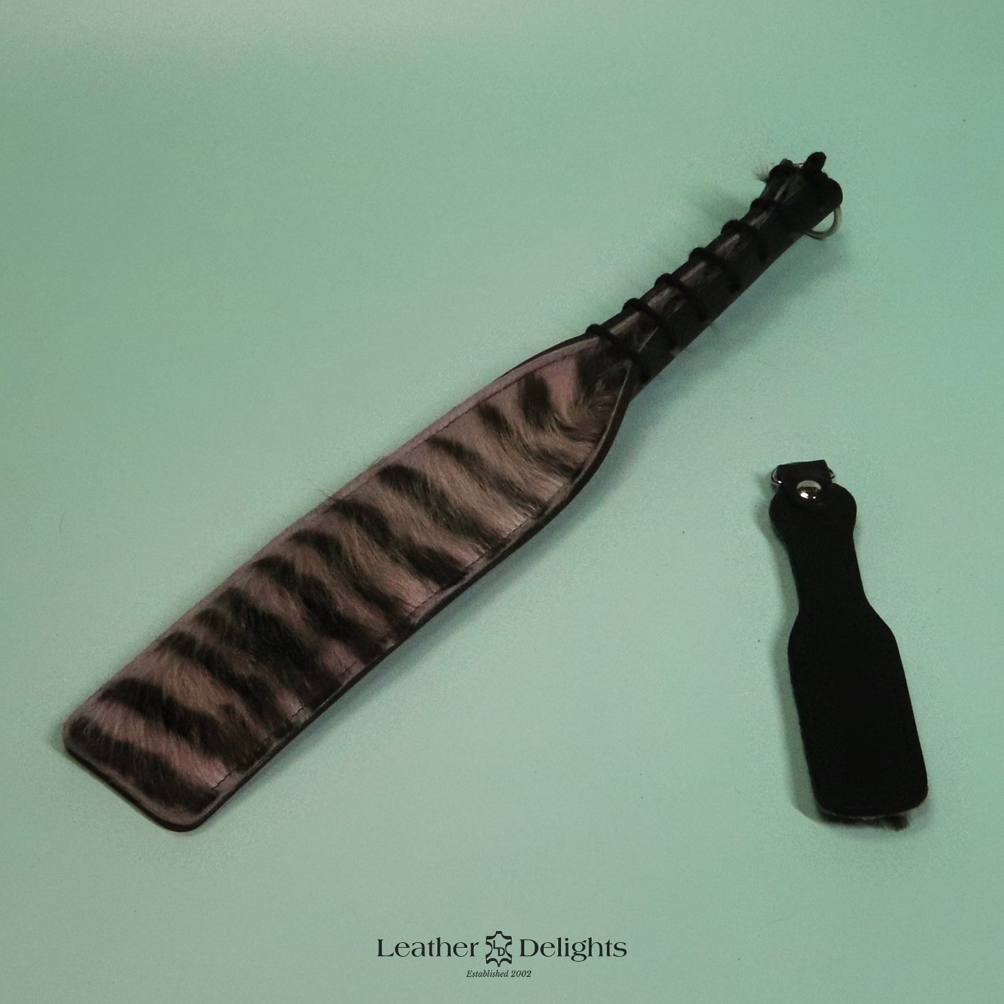 Add a touch of wild luxury to your collection with our unique Double Cheek Slapper, featuring striking green zebra-patterned sheepskin. The distinctive design combines patterned sheepskin with premium black vegetable-tanned leather backing, creating a paddle that's both exotic and functional. Handcrafted in our UK workshop. The sheepskin-leather construction ensures a perfect balance of gentle caress and firm impact, delivering versatile sensations with every strike. Like all our implements, this paddle comes with our lifetime guarantee and includes a matching mini paddle, making it a delightfully coordinated addition to any enthusiast's collection.