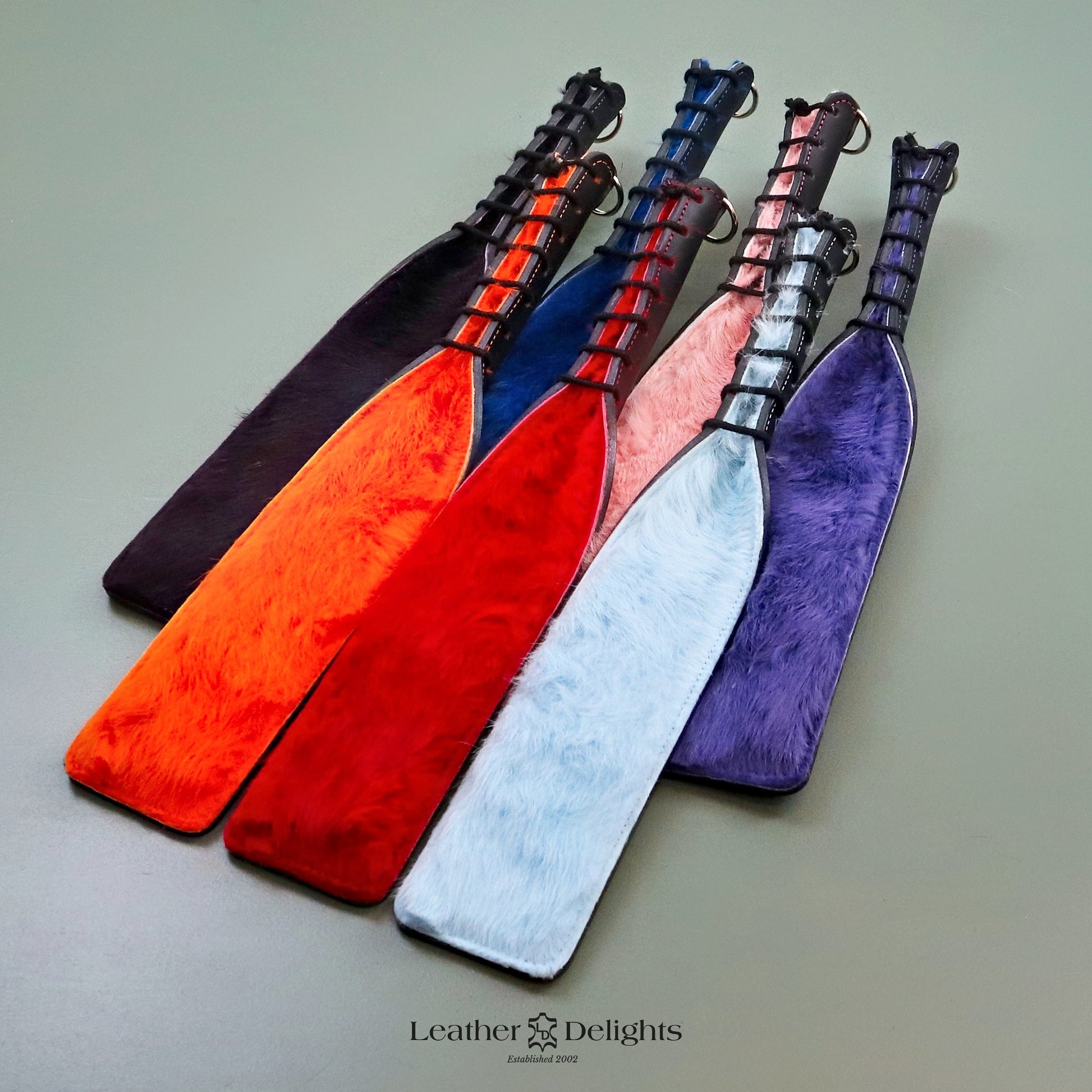 Experience the perfect balance of sensation with our Double Cheek Slapper, crafted from premium buffalo or buttero leather. Choose buffalo leather for a firmer impact or buttero for a lighter touch, each side paired with ultra-soft English Rabbit fur for a gentle, sensual caress. Ideal for those seeking versatile play, the slapper offers both intensity and softness in one elegant tool. Elevate your experience with this high-quality, dual-textured paddle.