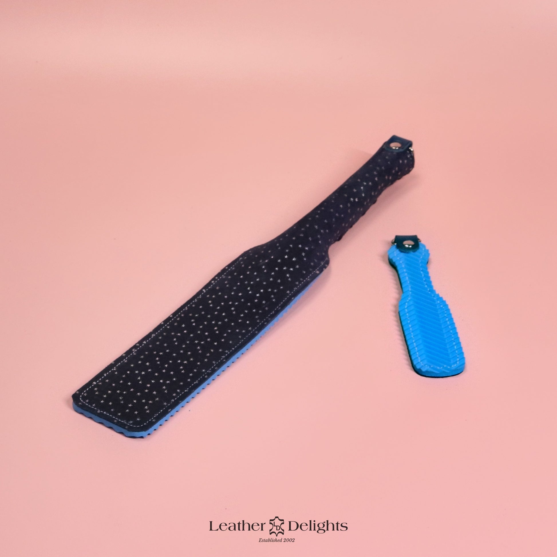 Add a touch of celestial elegance to your collection with our unique Double Cheek Slapper, featuring a distinctive stars design. The distinctive design combines stars suede with textured blue ripple rubber backing, creating a paddle that's both enchanting and functional. Handcrafted in our UK workshop. The suede-rubber construction ensures maximum impact, delivering firm, consistent sensations with every strike. Like all our implements, this paddle comes with our lifetime guarantee and includes a matching mini paddle, making it a delightfully coordinated addition to any enthusiast's collection.
