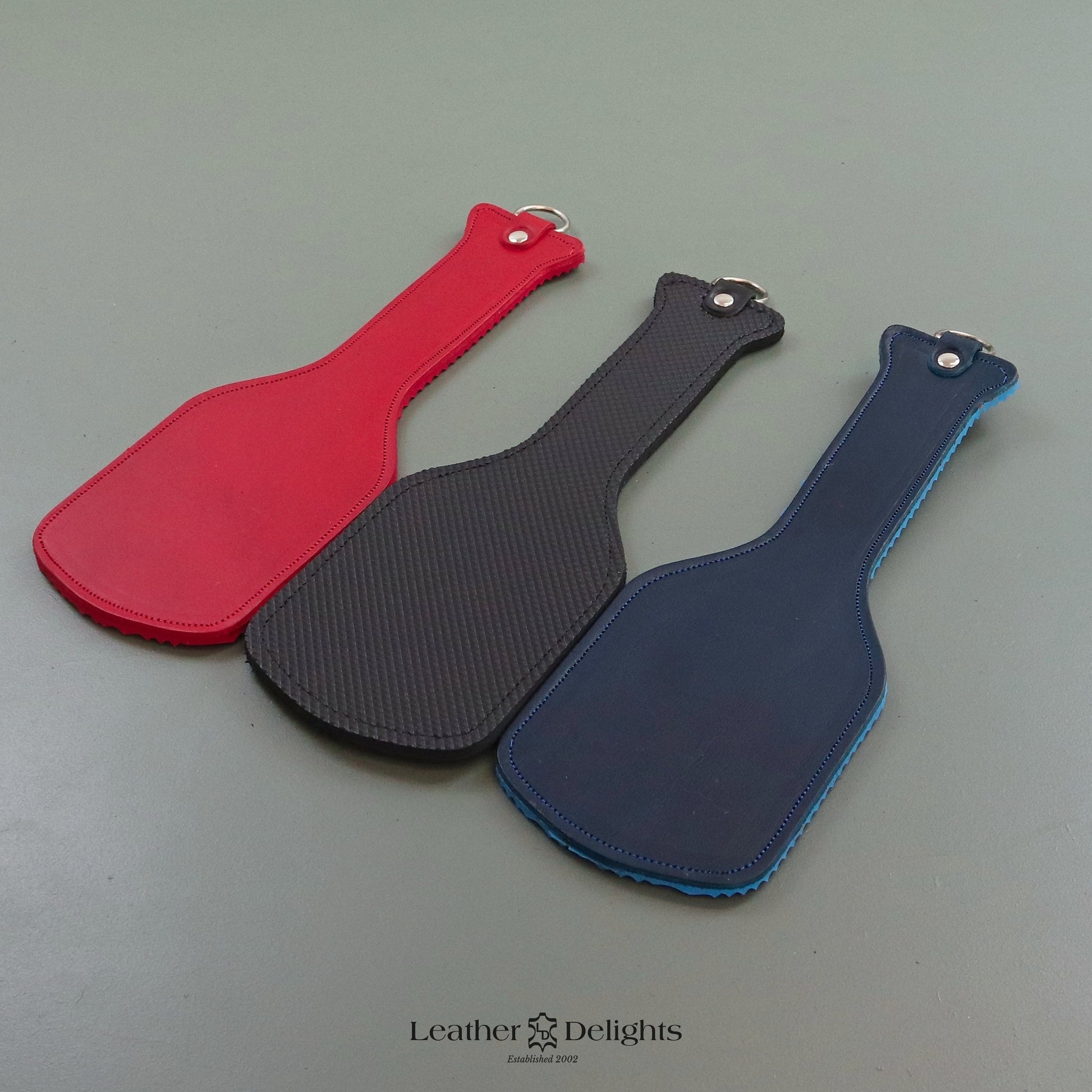 - Dimpled Rubber: 6mm thick dimpled rubber provides a distinctive, tactile experience on BDSM paddles, offering a firm grip and a stimulating, textured impact that enhances the visual and sensory intensity.