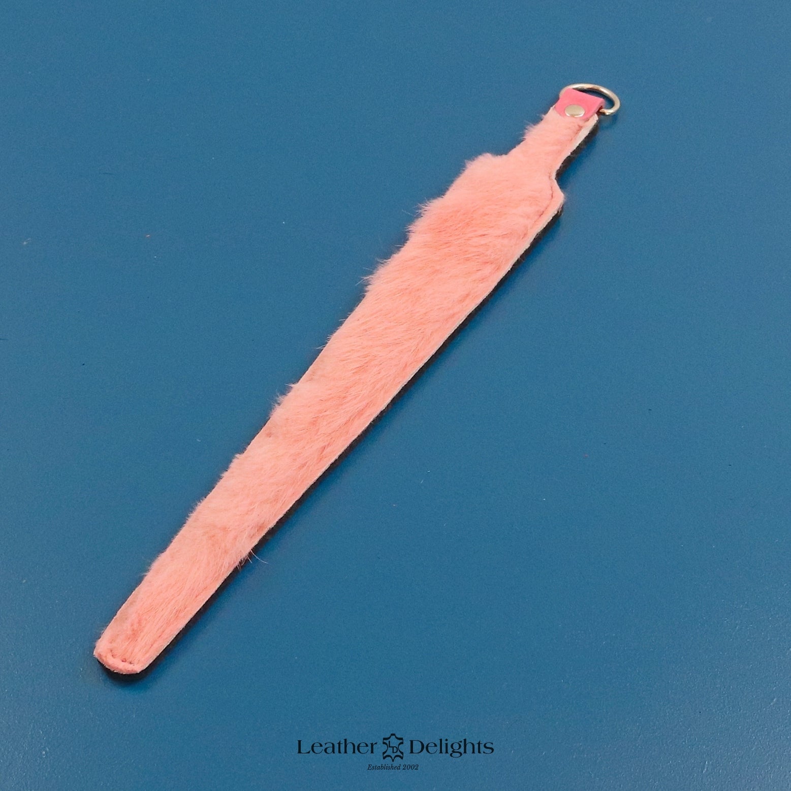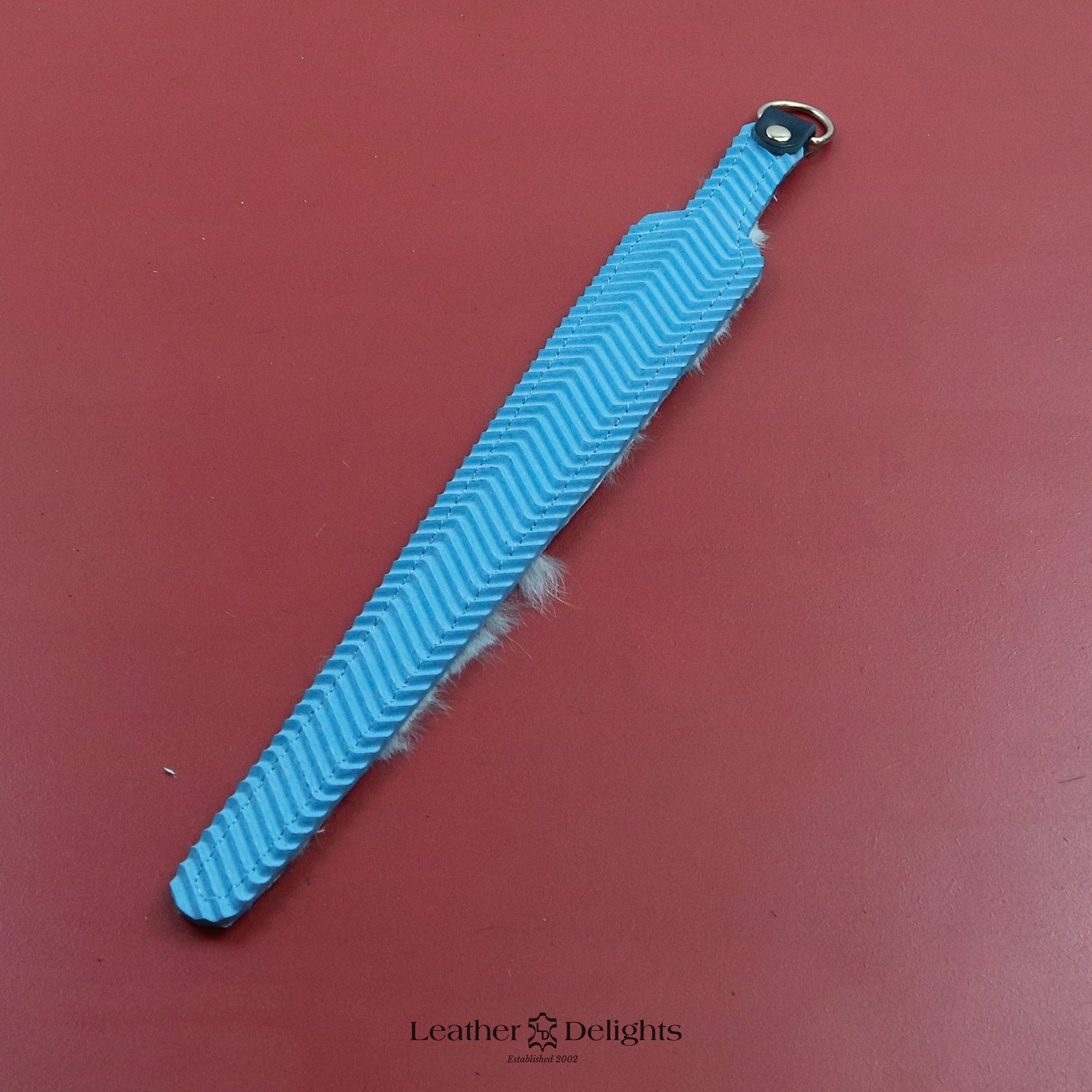 Introducing our Needle paddle, aptly named for its pointed end designed to tantalise those intimate areas with precision. For sensations, you have a choice: the 4mm thick ripple rubber for a textured, stimulating touch, or the 6mm thick dimpled rubber for a sharper, more intense feel. And for a soft, sensuous contrast, we've adorned it with ethically sourced, dyed English rabbit fur. This paddle offers a unique combination of precise stimulation and gentle indulgence, perfect for exploring a wide range of sensations in your play.