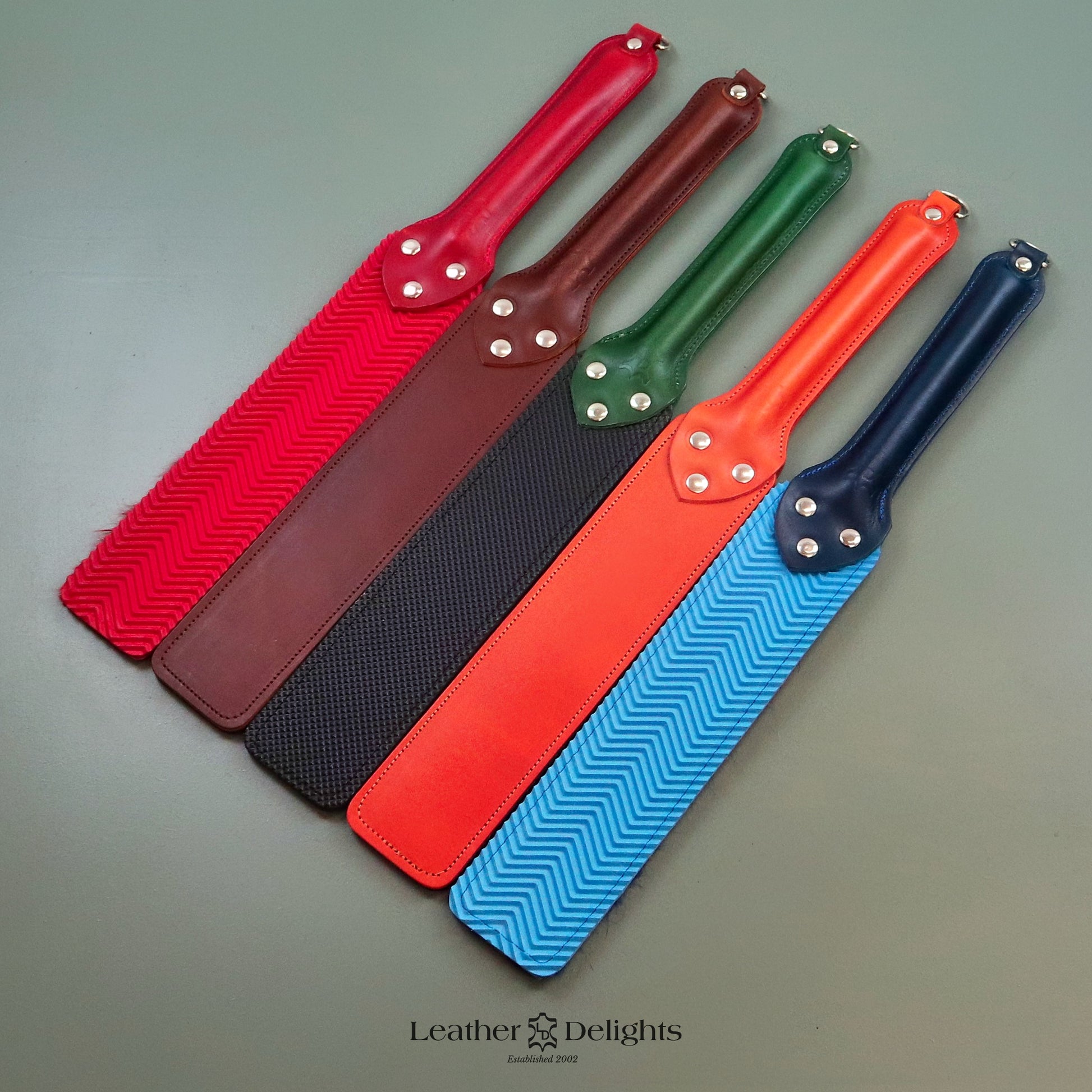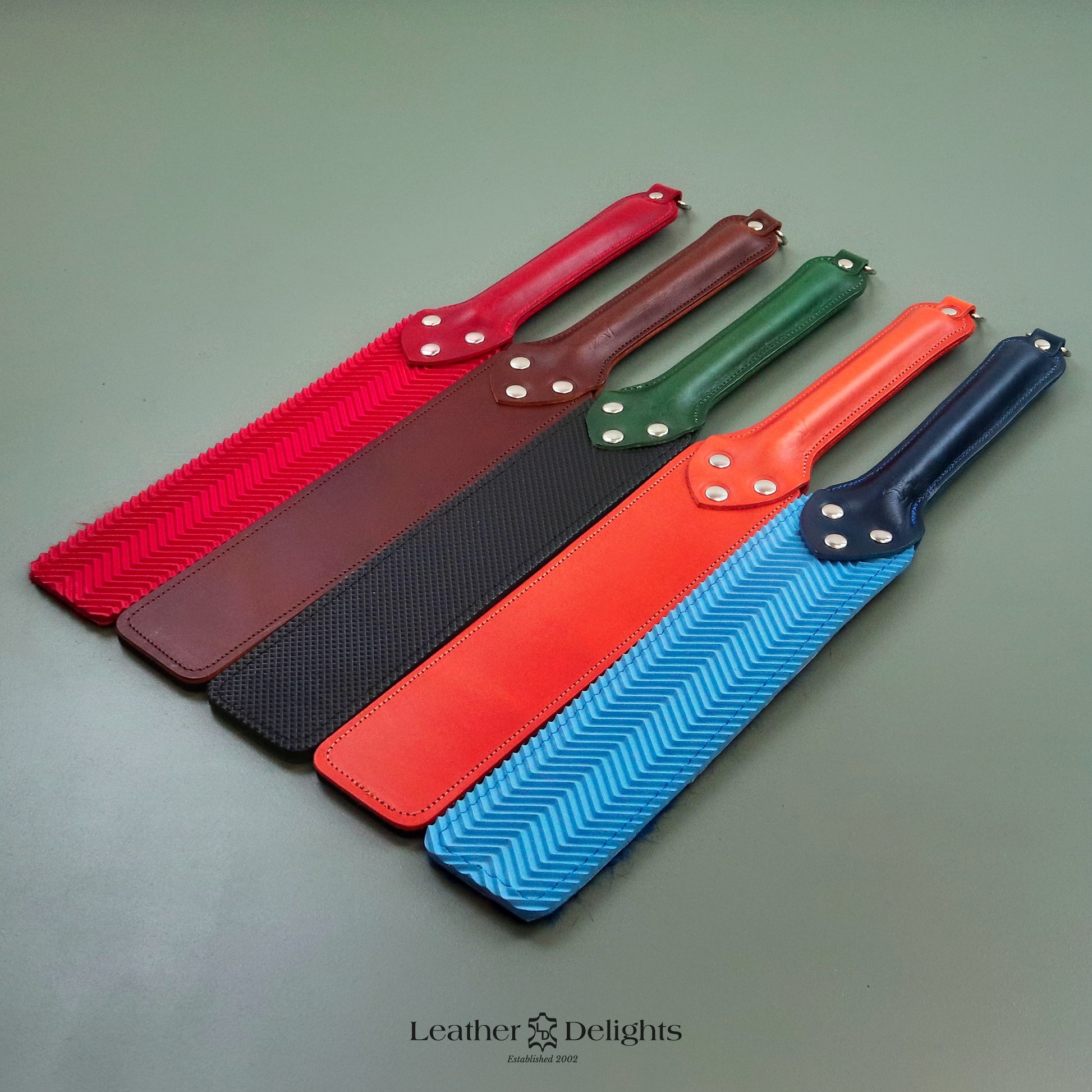 - Tyre Tread Rubber: 5mm thick tyre tread rubber lends a distinctive, industrial look to BDSM paddles, providing firm, textured impact that is both visually bold and functionally resilient.