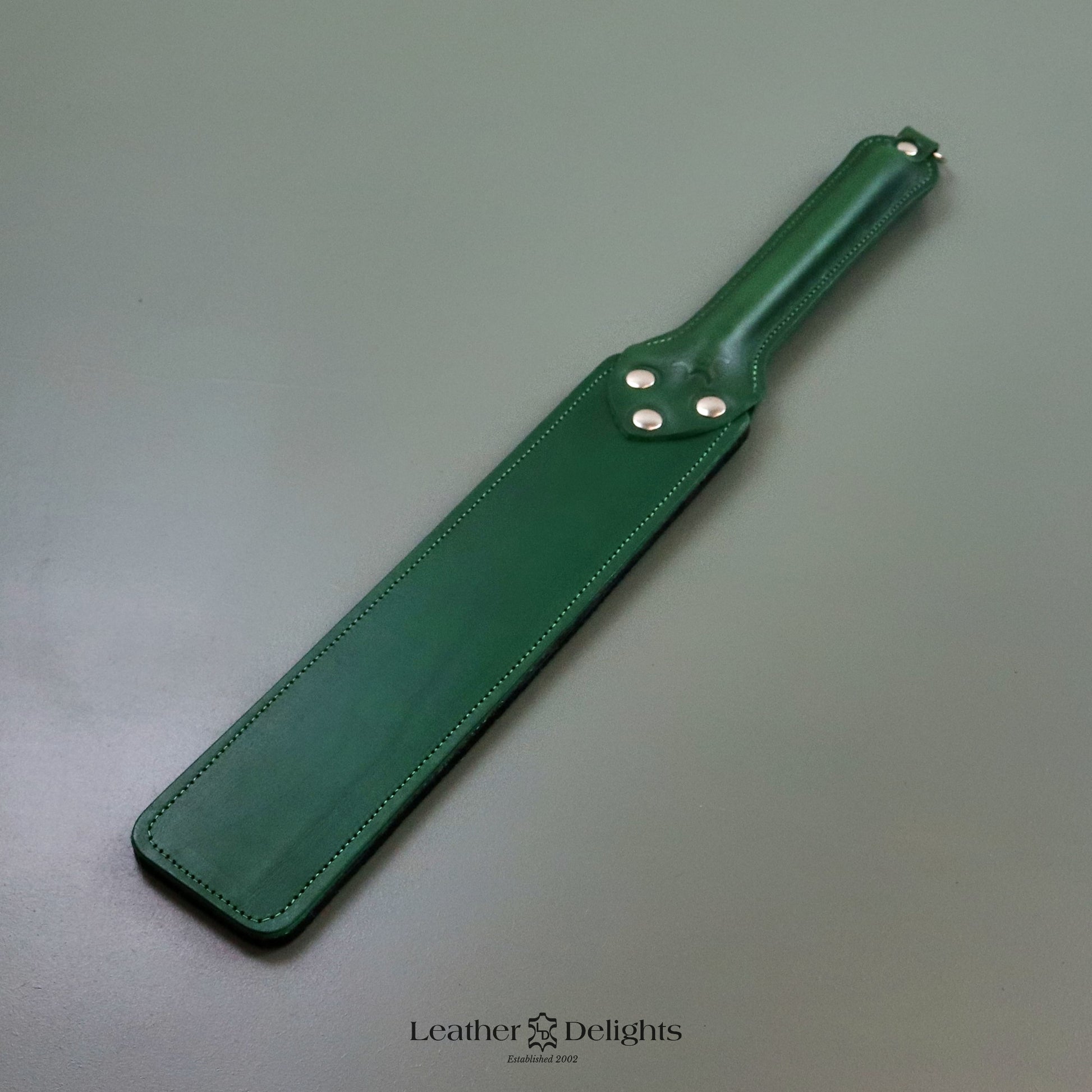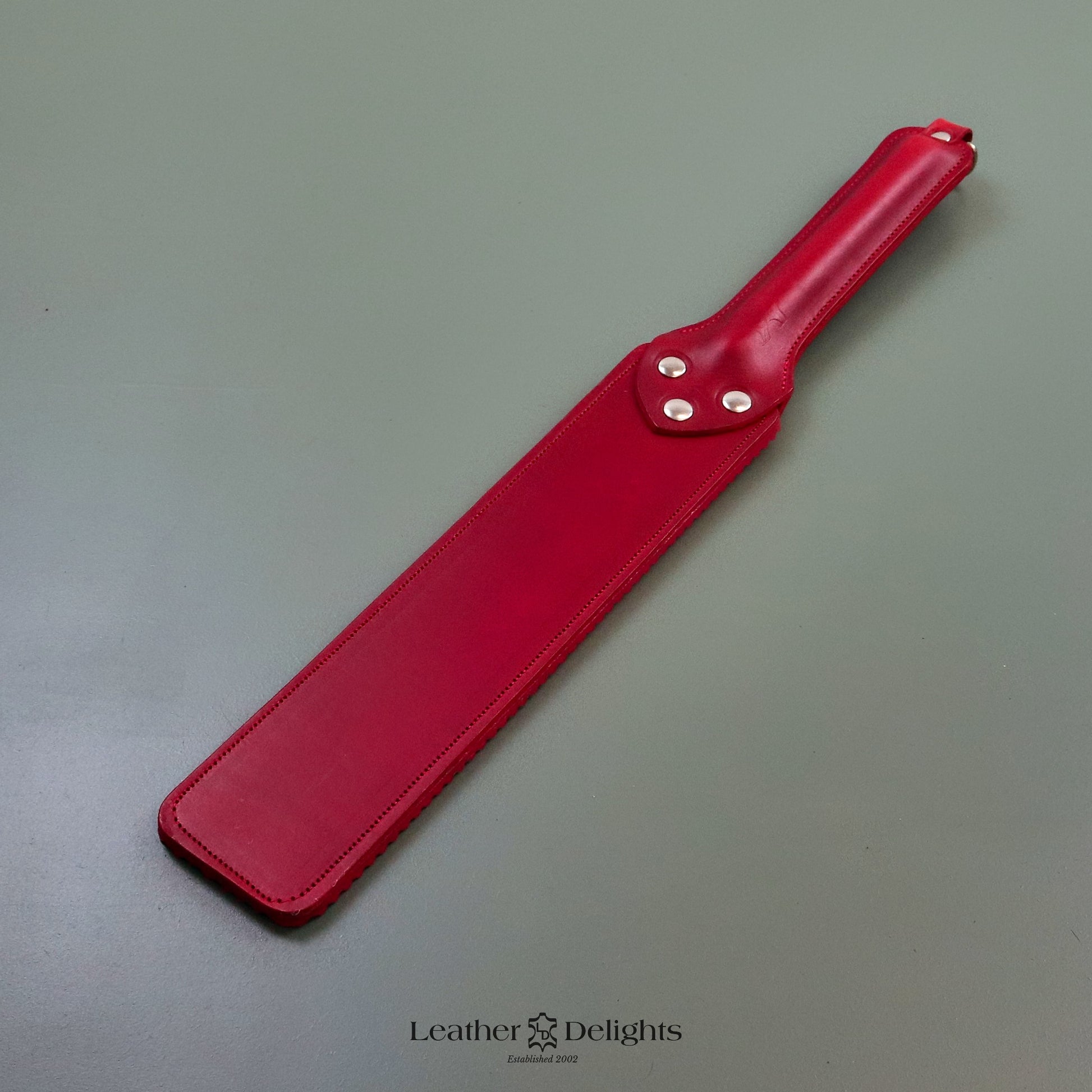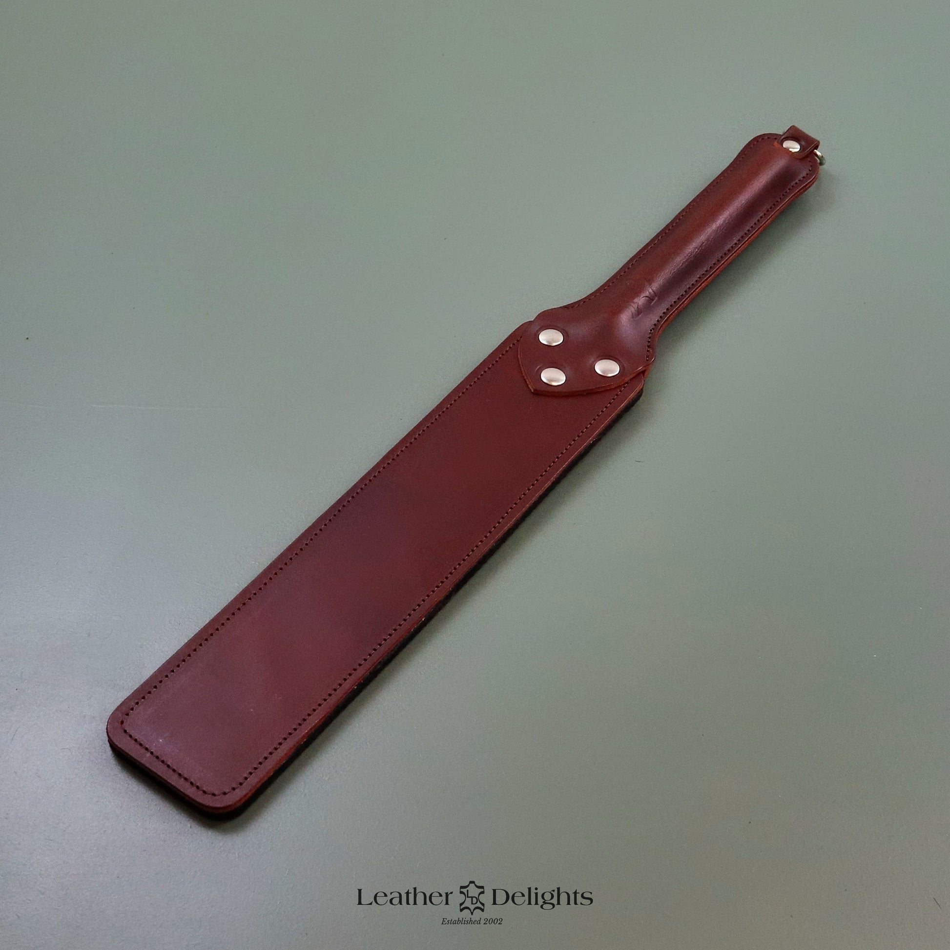 Discover the unique duality of our Punishment Paddle, designed to cater to a range of sensations. On one side, choose from our 4mm thick ripple rubber for a textured, stimulating impact or the 6mm dimpled rubber for sharper, more intense strikes. Flip it to experience the contrast with our leathers: the 6-7oz thick Walpier Buttero for a firm yet gentle hit, or our super soft 3-4oz biker leather for a more subtle, caressing impact. This paddle is perfect for those who love to mix it up, offering a blend of sharp precision and soft indulgence in one versatile tool.