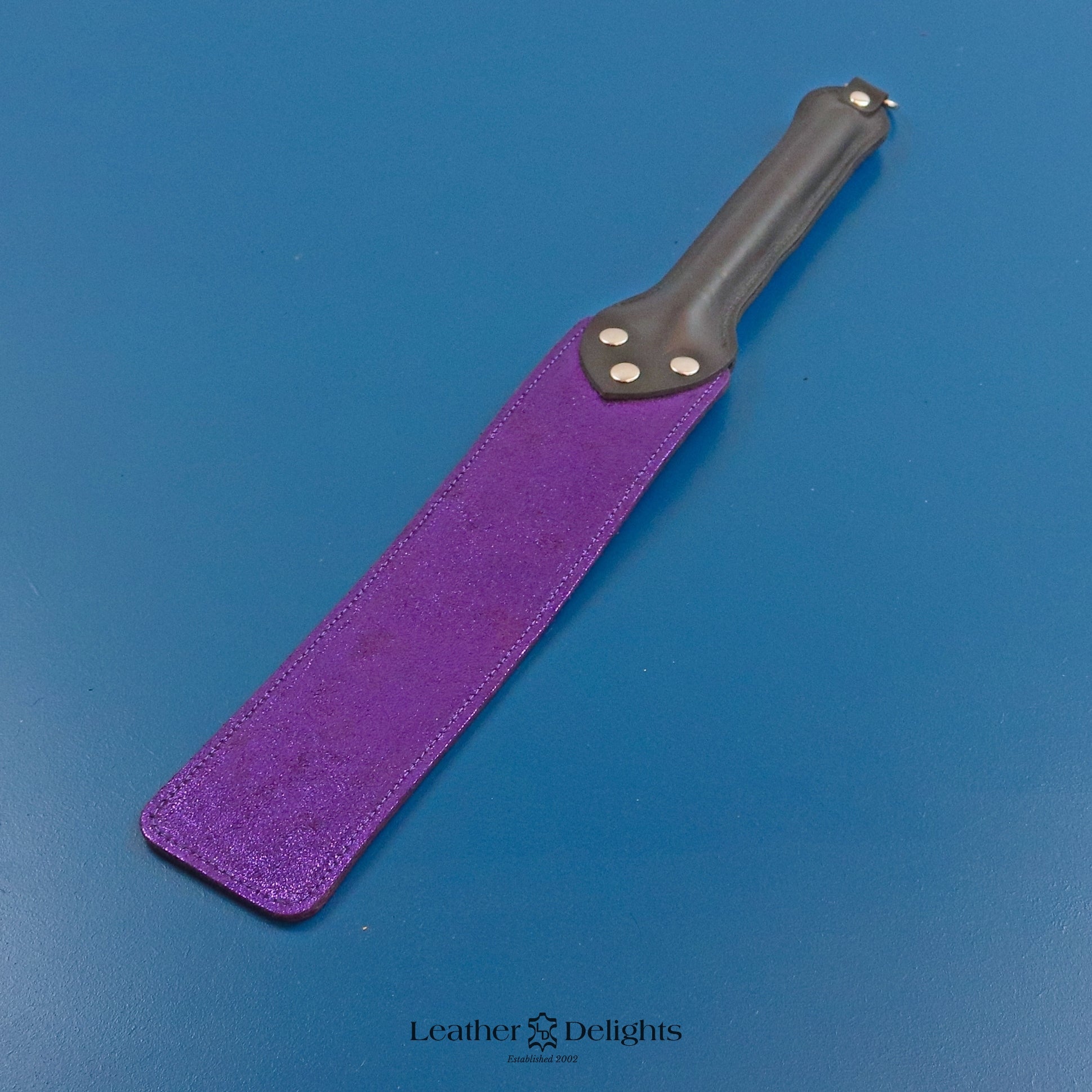 Discover the unique blend of sensations with our Punishment Paddle, featuring a choice between the robust 8-9oz buffalo leather and the refined 6-7oz Walpier Buttero leather, paired with luxuriously soft 3-4oz English suede. The leather side offers a firm, impactful experience, perfect for those who crave a strong presence in their play. Flip it over to caress with the suede side, offering a softer, more sensual touch, ideal for warming up or gentle play. This paddle beautifully marries intensity with tenderness, catering to a wide range of preferences and moods.