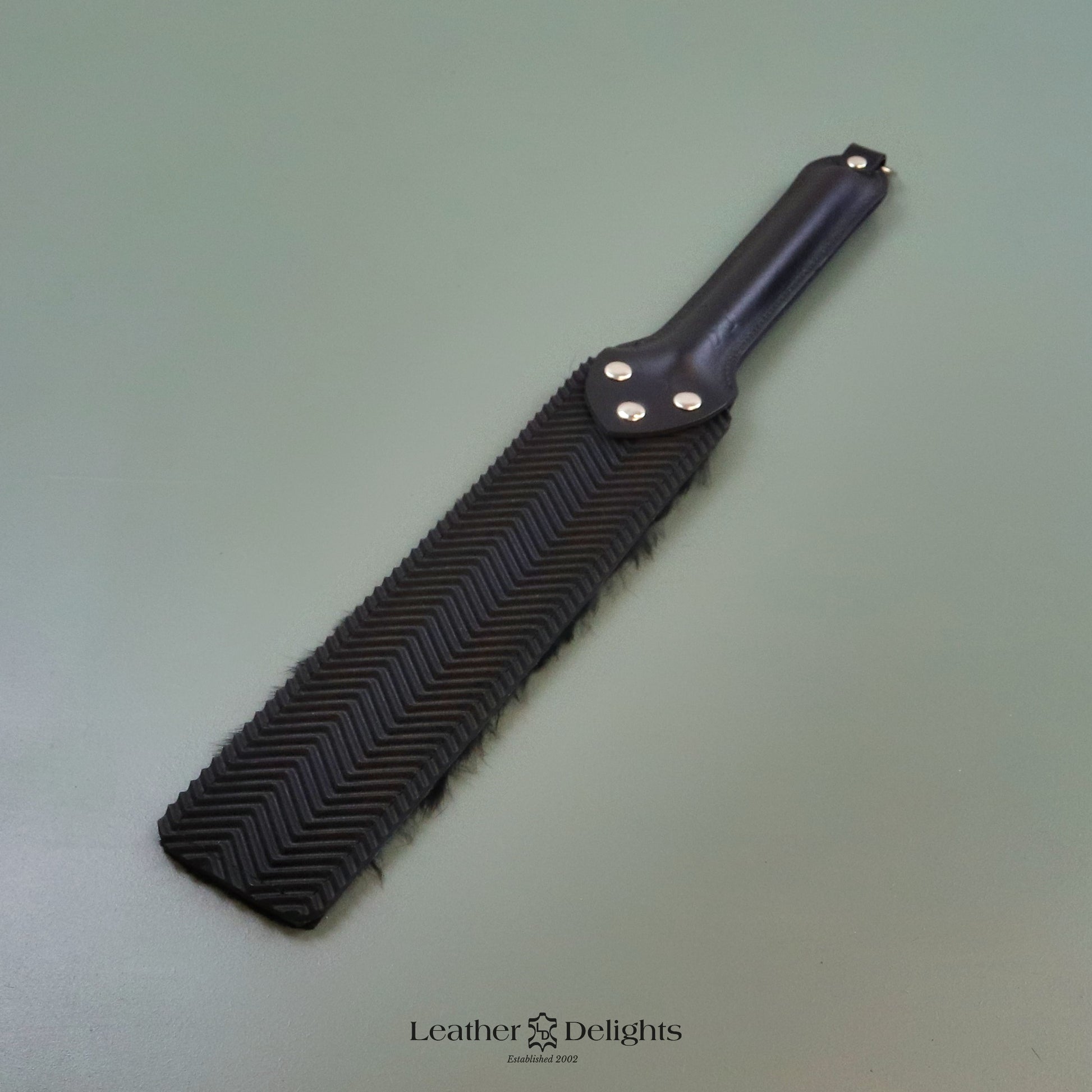 Introducing our versatile Punishment Paddle, a perfect blend of intensity and softness. On one side, choose between our 4mm thick ripple rubber for a textured, stimulating impact, or our 6mm dimpled rubber for a unique, concentrated sensation. Flip to the other side for a contrasting experience with our ethically sourced, dyed English rabbit fur, offering a gentle, soothing touch. This paddle is ideal for those who appreciate a dynamic range in their play, combining the sharpness of rubber with the soft caress of fur. Explore the thrilling duality of firm discipline and delicate indulgence in one exceptional tool.
