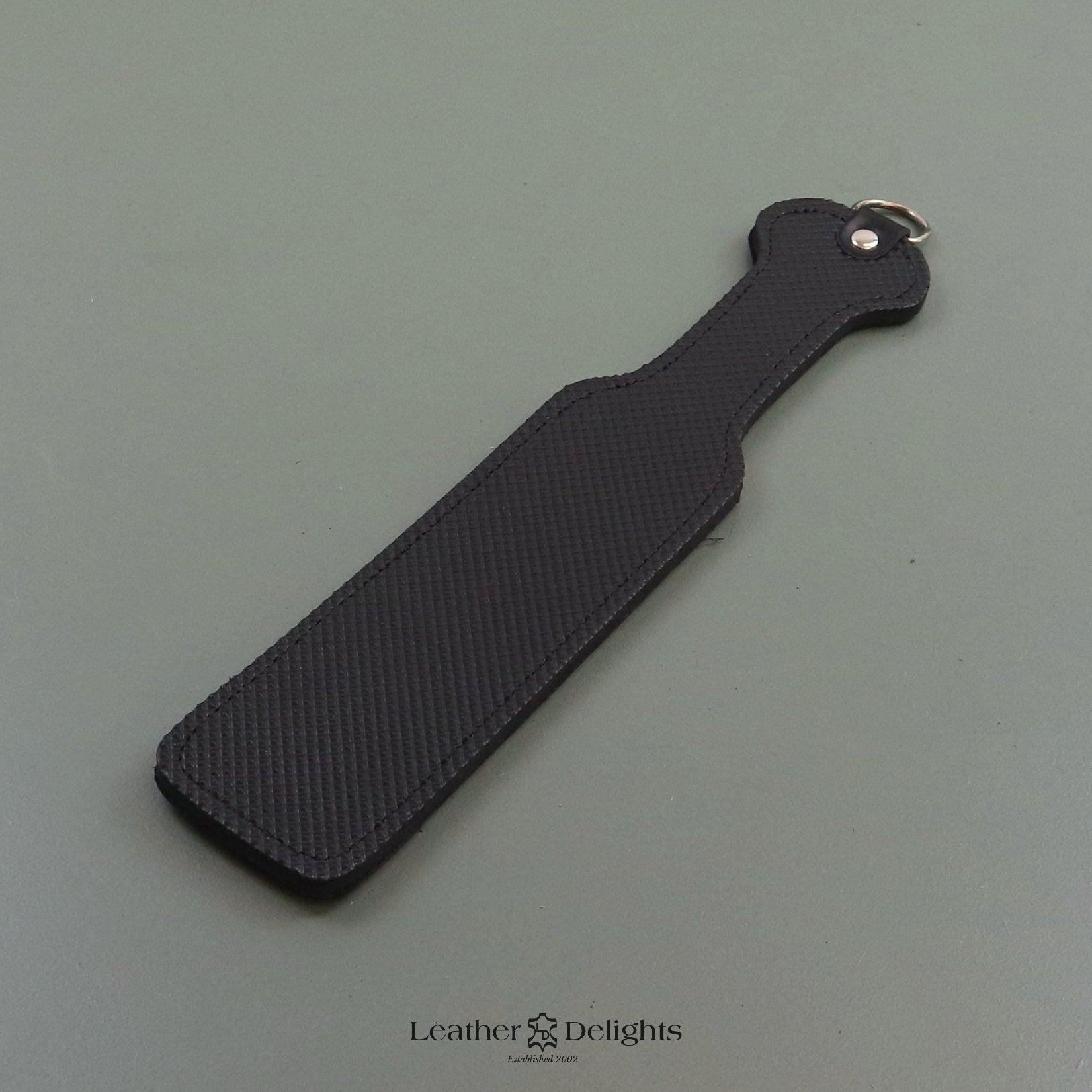 - Dimpled Rubber: 6mm thick dimpled rubber provides a distinctive, tactile experience on BDSM paddles, offering a firm grip and a stimulating, textured impact that enhances the visual and sensory intensity.