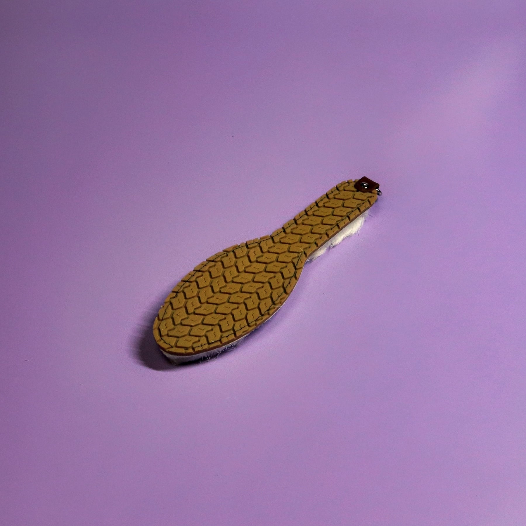 Discover distinctive design with this playful piece from our 2025 Vixen Collection - a handmade shoe sole shaped leather paddle measuring 11" in length. Featuring plush Scandinavian reindeer fur paired with limited edition beige tyre tread rubber, this uniquely contoured design showcases creative silhouette work and premium materials. Crafted in our Leicestershire workshop, this one-of-a-kind shaped paddle celebrates imaginative design and quality craftsmanship.