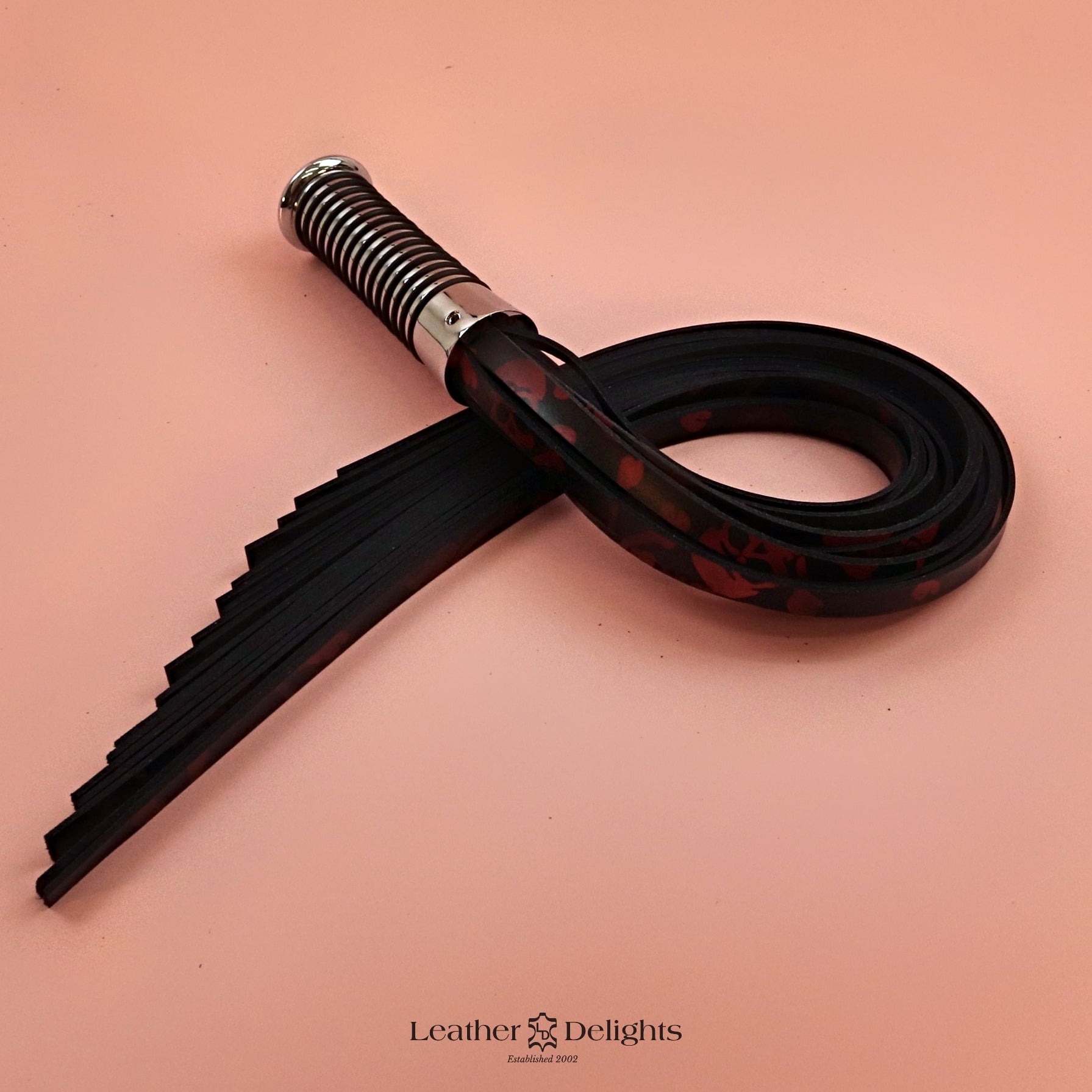 Unleash the allure of our Black & Red Skull Print Leather Torture Chamber Flogger, featuring a striking design and a sleek silver handle. Crafted from 2.5mm thick chrome-tanned leather, this flogger is both visually stunning and effective. Its 10mm wide falls deliver a satisfying snap and a moderate sting, making it ideal for those who seek both style and substance in their play. Perfect for themed sessions or as a standout piece in any collection, this flogger combines dramatic aesthetics with functional performance.