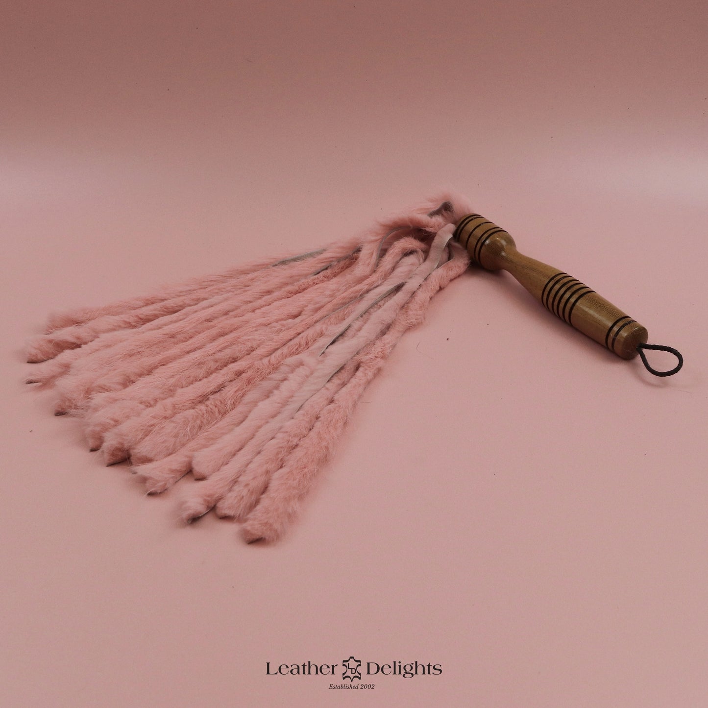 A rabbit fur flogger is the epitome of gentle, sensual play in the BDSM realm. Its primary use is for soft, sensory stimulation rather than traditional impact play. The ultra-soft fur provides a delicate, tickling touch, making it ideal for beginners or for those who enjoy light, teasing sensations. It's perfect for warming up the skin, heightening sensitivity, and enhancing foreplay. The luxurious feel of rabbit fur adds a touch of elegance and comfort, making it a popular choice for sensual exploration, intimate scenarios, and for those seeking to introduce a gentle, tactile element into their play.