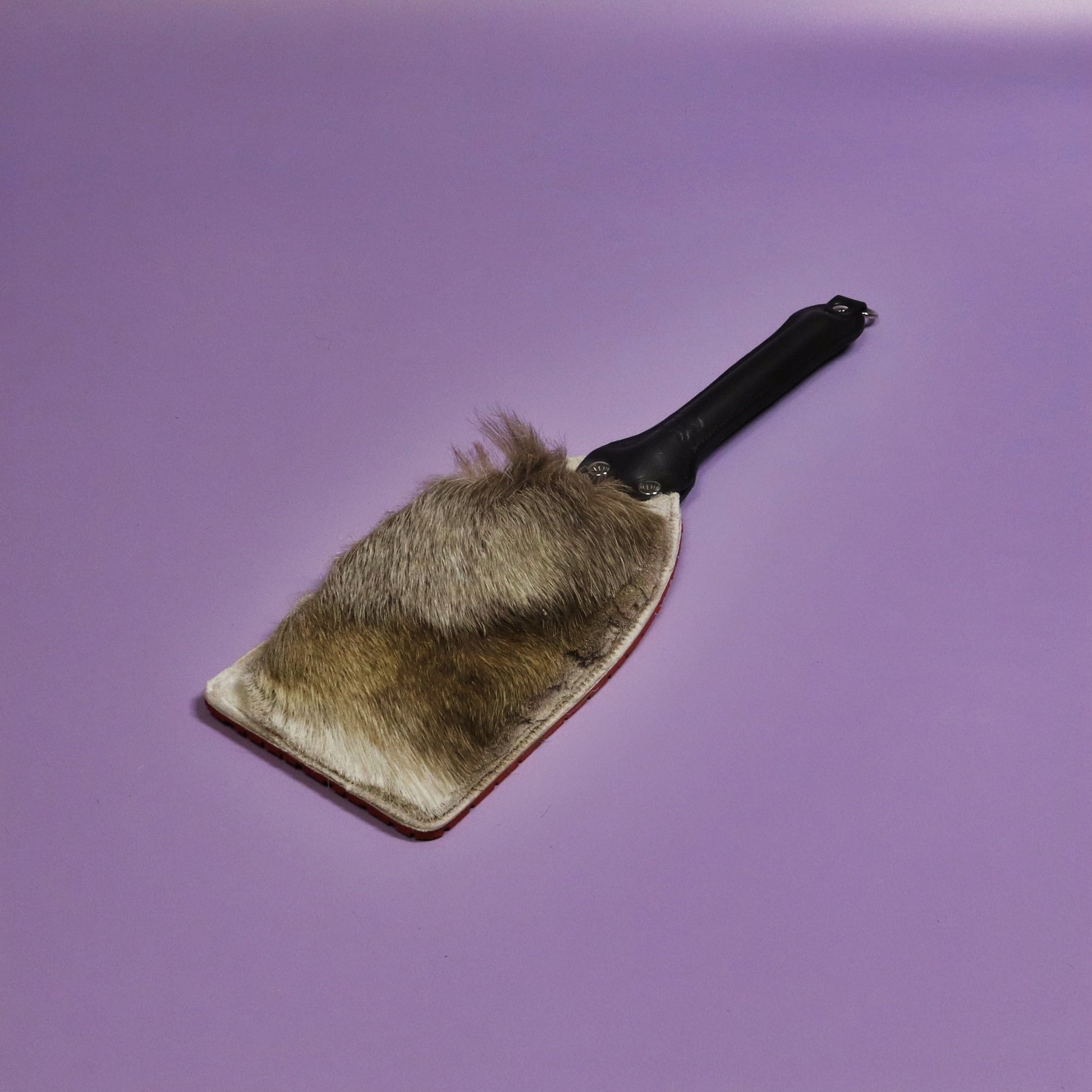 This paddle's built around Scandinavian reindeer hide paired with red tyre tread rubber - not a subtle combination. The hair-on hide sits over the rubber backing, creating a contrast between the soft exterior texture and the structured support underneath. Part of our 2025 Reindeer Collection, this is Blitzen - a one-of-a-kind piece with an unrepeatable hide pattern. The red rubber makes this one stand out visually.